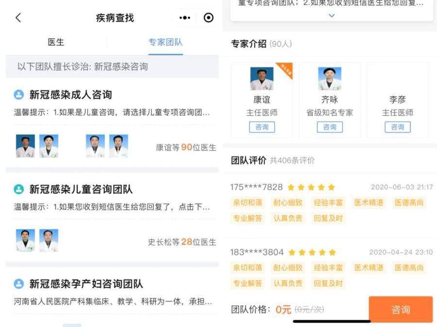 2.点击新冠感染咨询、心理咨询等板块发起问诊,选择需要问诊的专家,点击进入咨询页面。