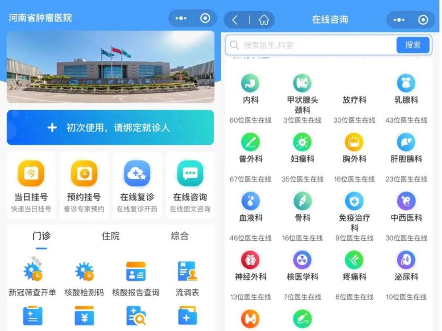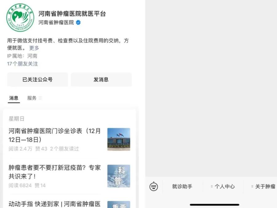 1.微信关注“河南省肿瘤医院就医平台服务号”→【就诊助手】进入问诊页面。