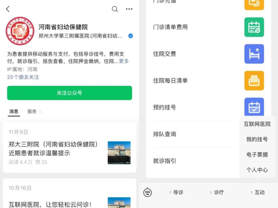 1.微信关注“郑州大学第三附属医院(河南省妇幼保健院)服务号”→【互动】进入互联网医院页面。