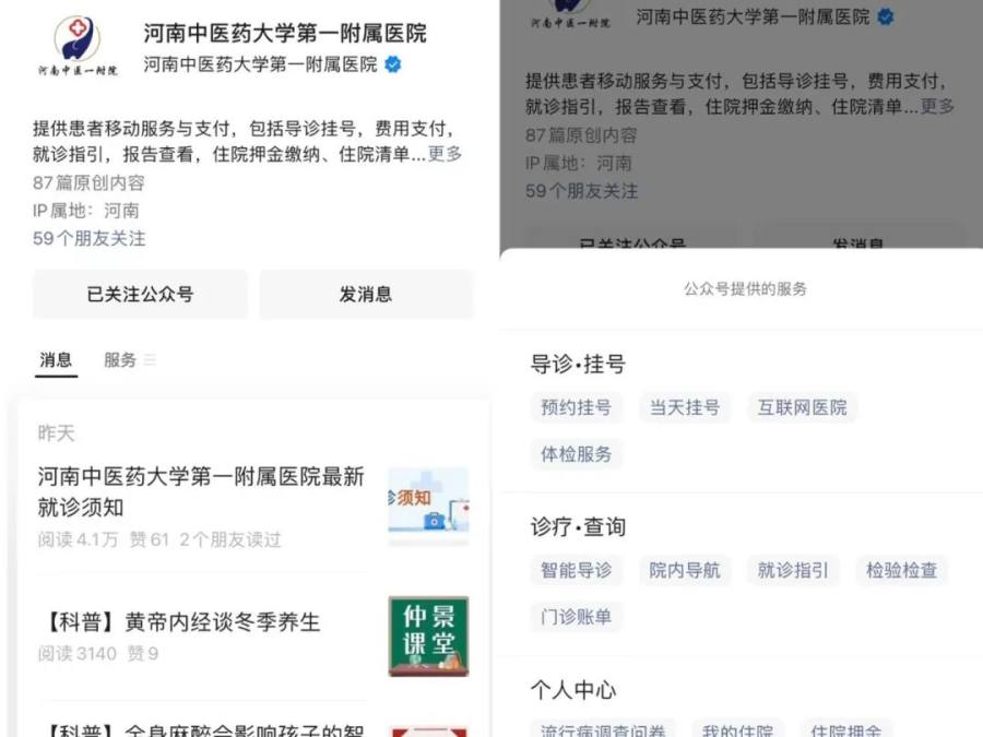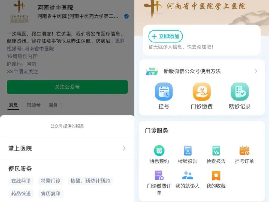 1.微信关注“河南中医院大学第一附属医院”→【服务】进入【互联网医院】页面,或微信小程序搜索“豫中一”。