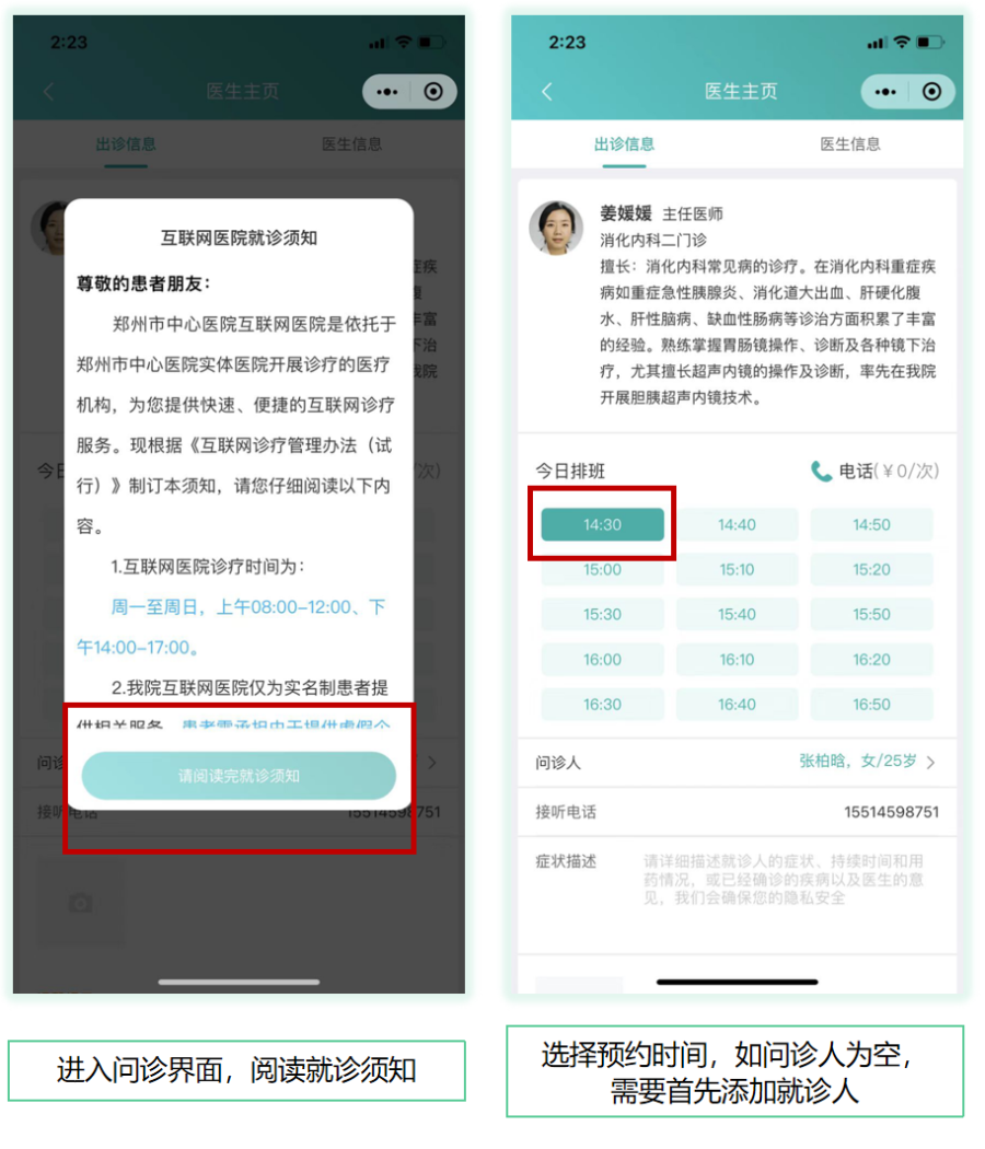 2.点击【咨询医生】,选择科室、预约问诊时间发起预约问诊。