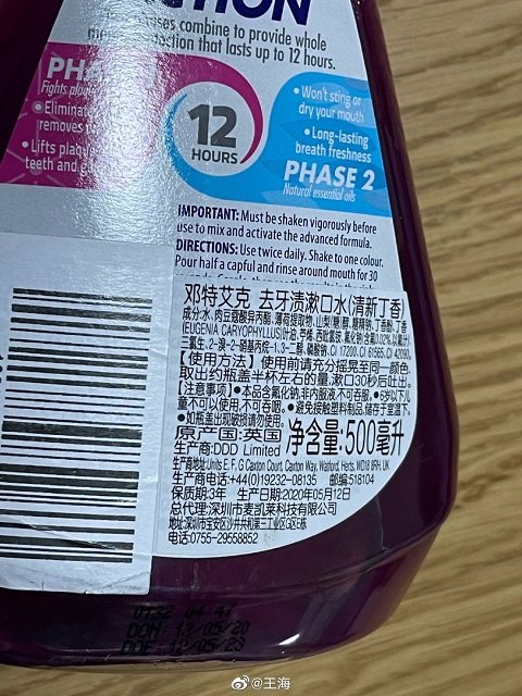 采访中,王海进一步称,“我们从英国公司之家等权威可靠渠道拿到更准确的信息是,DDD公司今年2月以后就没有生产过邓特艾克这款漱口水了。”