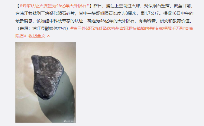 “火流星”坠落浙江,专家认证:为46亿年天外陨石
