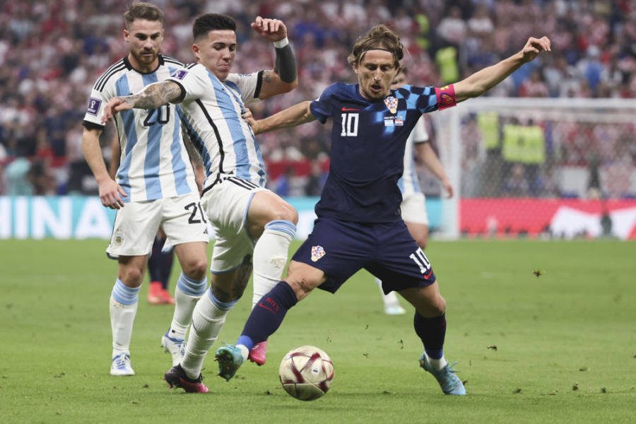 12月13日,克罗地亚队球员莫德里奇(右)与阿根廷队球员恩佐·费尔南德斯(中)在比赛中拼抢。新华社记者 兰红光 摄