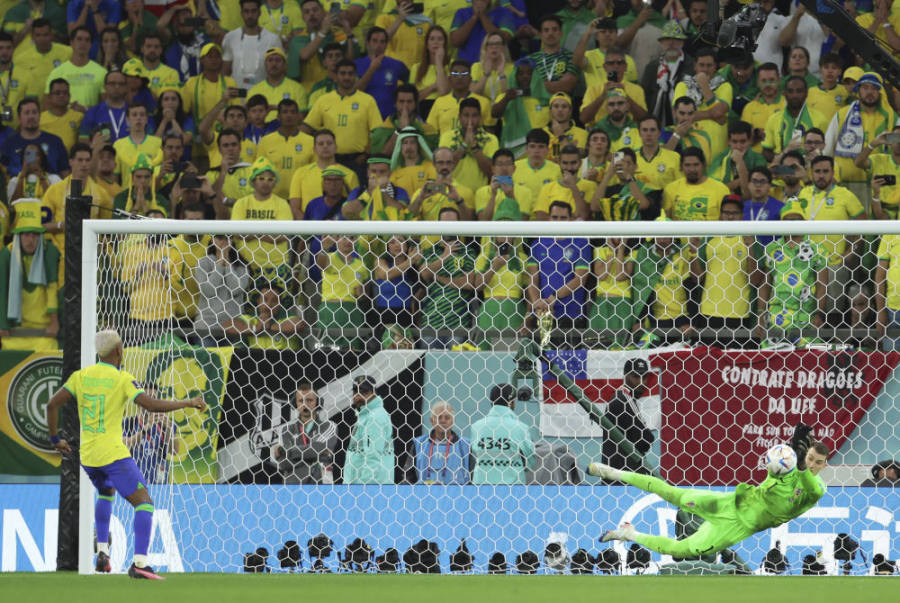12月9日,克罗地亚队守门员利瓦科维奇(右)在点球大战中扑出巴西队球员罗德里戈的射门。新华社记者 李明 摄