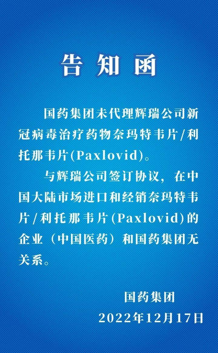 国药集团:未代理辉瑞公司新冠病毒治疗药物
