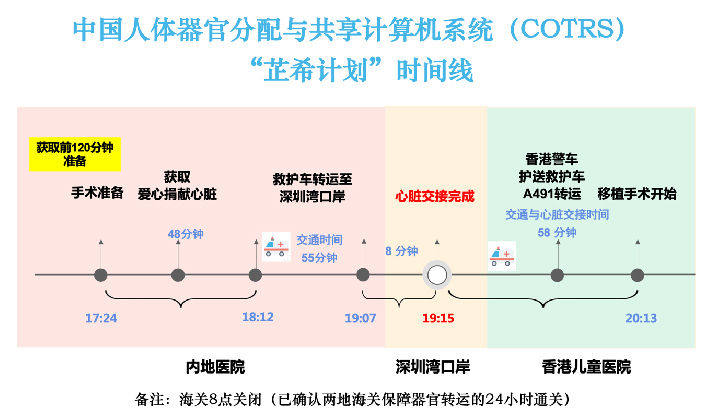“在COTRS的协调下,内地与香港近24个部门和65位医疗与管理专家在24小时内紧急通力合作,两地医疗团队以及深圳与香港海关均进行紧急模拟演练,将通关时间压缩至8分钟,与4个小时的心脏保存极限时间赛跑。”王海波介绍,12月16日17时24分开始捐献心脏获取,当日20时13分救护车在香港警车护送下将内地爱心捐献心脏送达香港儿童医院。12月17日凌晨1时,芷希小朋友的心脏移植手术顺利完成,从手术室转入儿科ICU。截至目前,芷希已不需要体外循环支持。