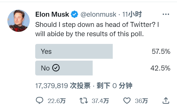 财联社12月19日电,马斯克在推特就其“是否应该卸任推特CEO”发起投票,截至投票通道关闭,投赞成票的有57.5%,投反对票的有42.5%。马斯克表示,他将遵守此次投票结果。