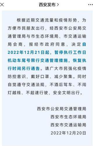 12月20日,陕西西安多部门发布通知,根据近期交通流量和疫情形势,为方便市民朋友出行,决定自2022年12月21日起,暂停执行工作日机动车尾号限行交通管理措施,恢复执行时间另行通告。