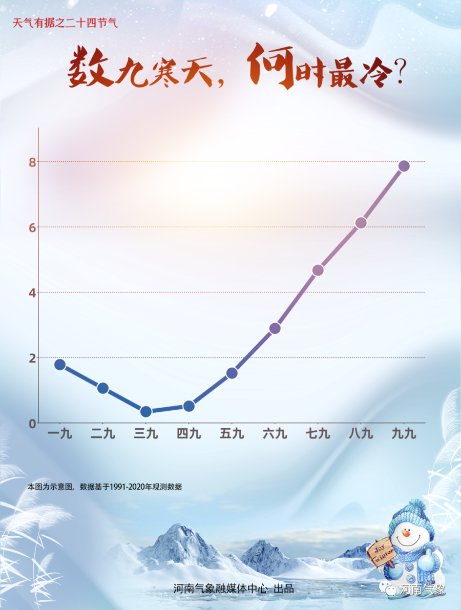 1991-2020年的统计数据显示,我省平均气温是在“三九”期间达到“低谷”,“五九”开始有明显回暖迹象。这也正符合人们常说的“冷在三九”。