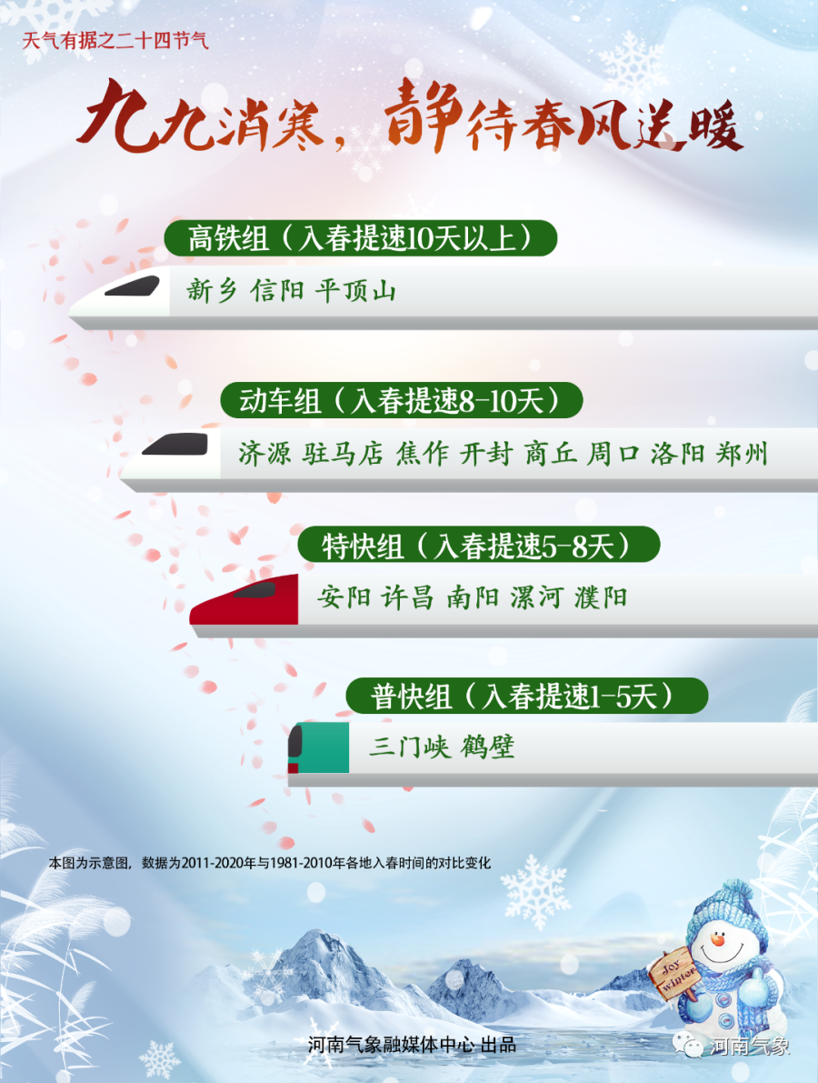 近些年,河南多地的入春步伐是越来越快了,如同火车提速一般,大部地区提前幅度都超过5天,像是新乡、信阳、平顶山等地的平均入春时间甚至提前了10天以上。最慢的三门峡、鹤壁入春提速时间也在1-5天之间。