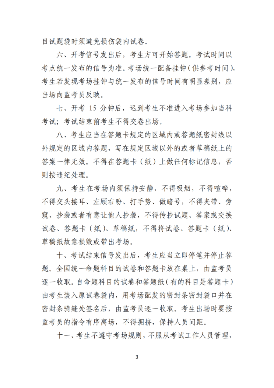 精心准备,准时赴考。请考生提前打印好《准考证》,认真阅读考生须知及特别提醒。根据核酸检测结果和“一类一策”的要求,考生的考场和座位号可能会发生变化。请考生保持手机畅通,及时接收报考点发送的消息,务必记录好每一科的考场号和座位号,避免因走错考场耽误考试。