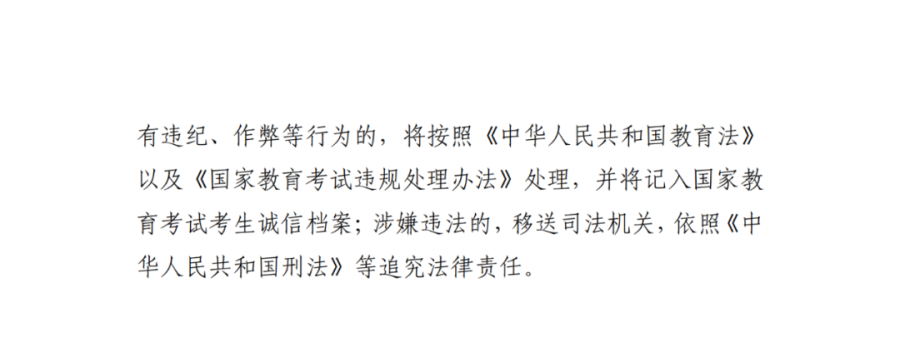 心怀敬畏,诚实应考。 希望你们遵守考试纪律,保持良好考试秩序,维护国家考试权威,维护考试公平,这是每一名考生应尽的义务。考试前请认真阅读《考场规则》,不将手表、手机等禁携物品带入考场。考场内已配有时钟,手机请按照要求服从考点统一管理。考生不遵守考场规则,不服从考务工作人员管理,有违纪、作弊等行为的,将依规处理,并记入国家教育考试考生诚信档案;涉嫌违法的,还会被追究法律责任(监督举报电话:0371-55610639)。