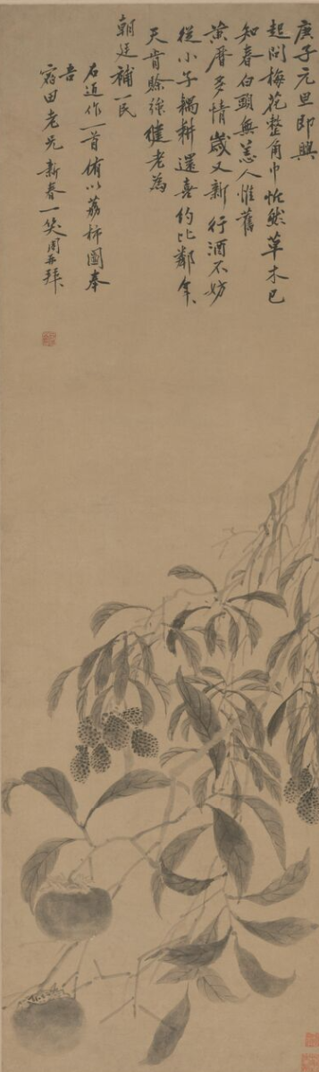 画上,沈周以水墨写柿子和荔枝数枝,枝叶交缠,自上方倒挂下来。