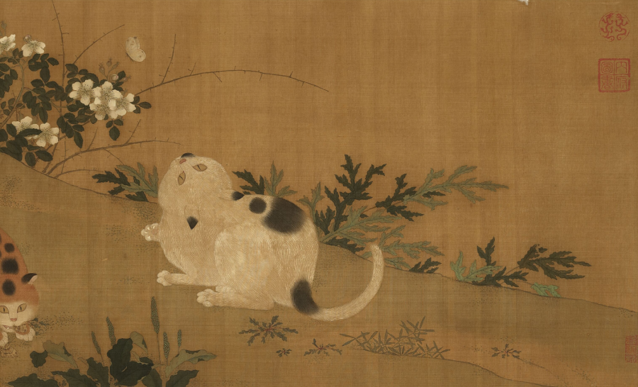画上两只猫一只蝶,看起来憨憨可爱,实则猫蝶谐音“耄耋”——老人七十为耋,八十或九十为耄,耄耋是祝人长寿之意。