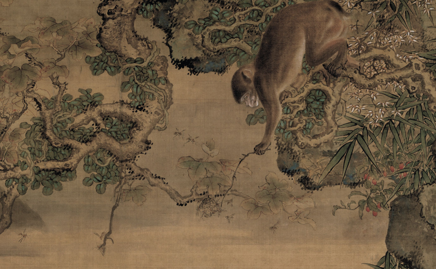 画上有多少花果、动物都不重要,顶重要的是,必须得有蜂和猴——沈铨画了临涧一棵老树下,四只猴子正仰望,顺着仰望的视线往上移,有只猴子爬到树干上正挑逗一个蜂巢,这一挑逗,想来还了得了……