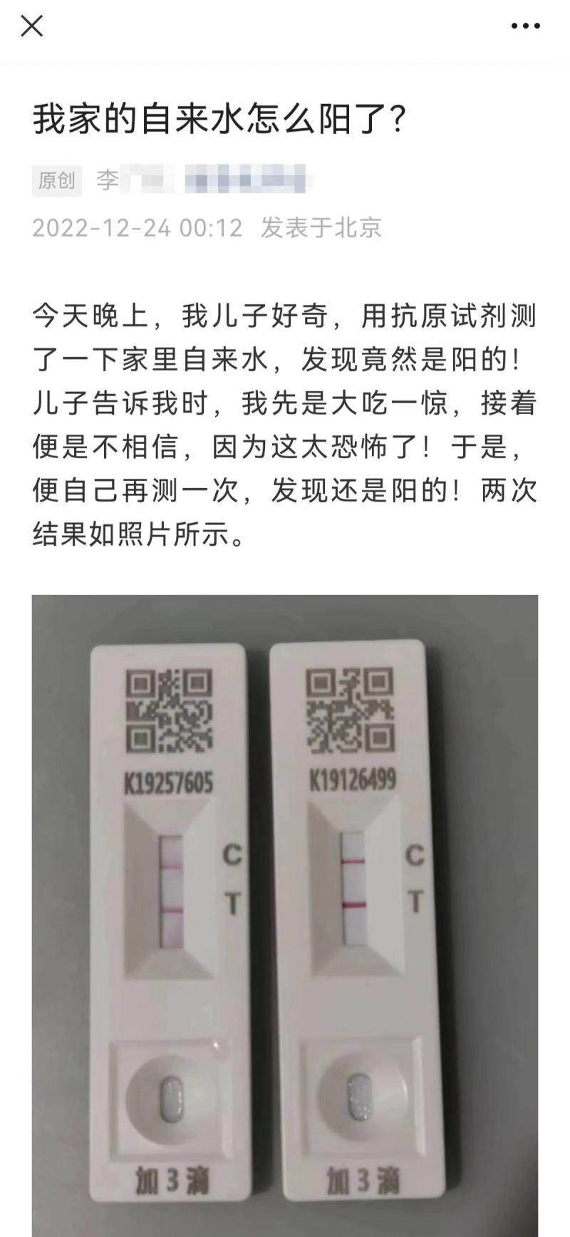 该公众号文章称,先用抗原试剂自带的滴管装入自来水,然后再将其滴入抗原测试板上,测试结果呈现“两道杠”,从而得出“自来水阳了”的结论。