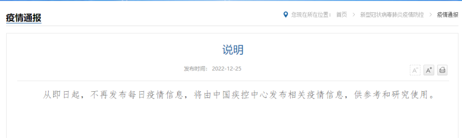 国家卫健委网站发布说明:从即日起,不再发布每日疫情信息,将由中国疾控中心发布相关疫情信息,供参考和研究使用。