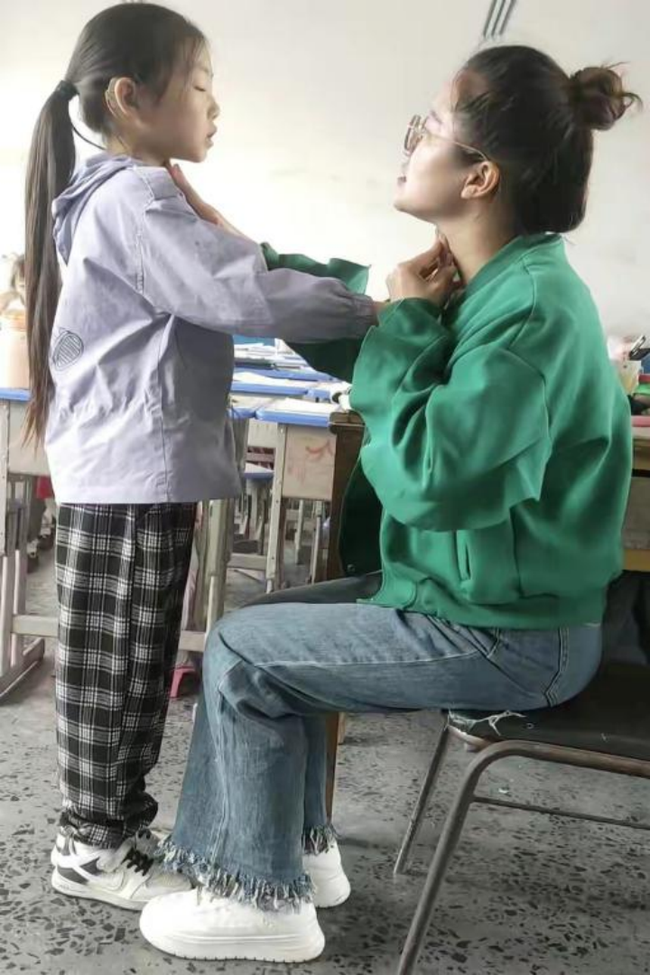倩倩老师:我们县里面是有这个特殊教育学校的,但是她妈妈没有把她送特殊教育学校。我向田雪洁的妈妈了解到,这是因为她的姐姐也有听力障碍,但在家里面能用简单的话和家人一起沟通。自从送到特殊教育学校之后,她姐姐回来之后不喜欢和大人说话,所以她的的爸爸妈妈看到这个情况之后,就想把田雪洁送到普通学校。