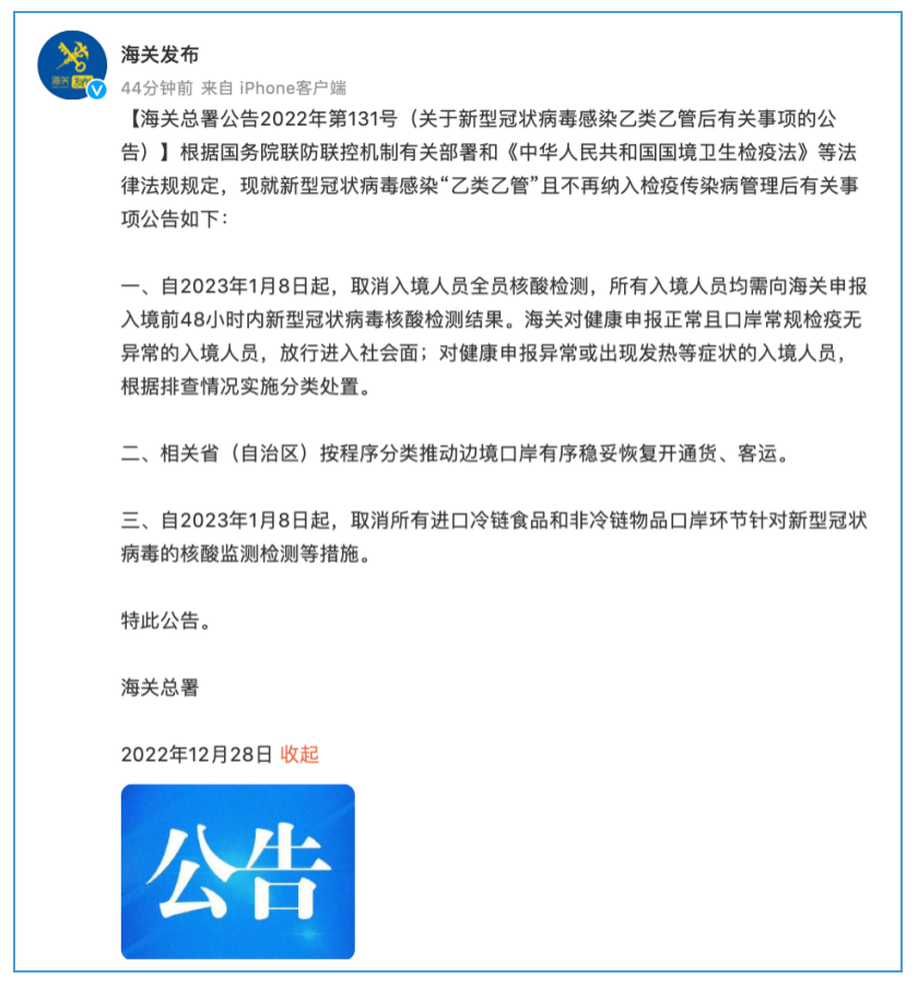 1.“乙类乙管”后,入境不再集中隔离,进口冷链食品不再抽样检测