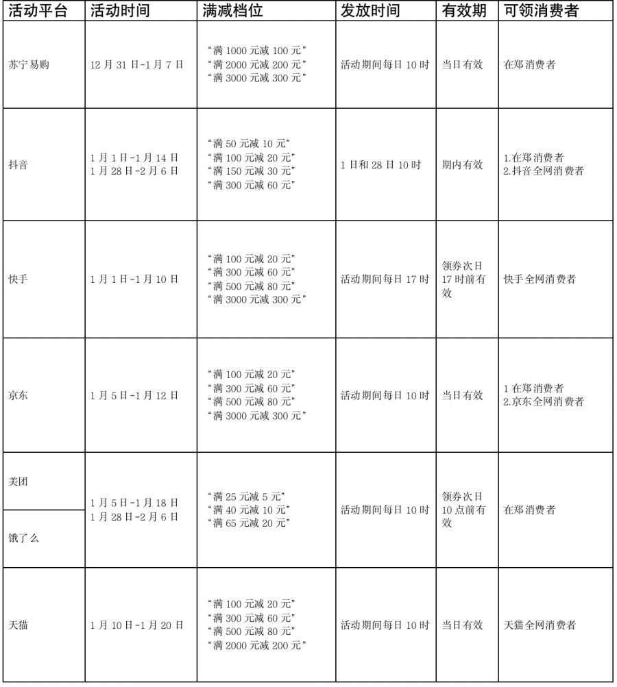 2022年12月31日-2023年1月7日期间,将在苏宁易购平台面向在郑消费者发放1000万元电商消费券,共有“满1000元减100元”“满2000元减200元”“满3000元减300元”三个满减档位,郑州市全域消费者均可领取,支持在苏宁自营郑州仓指定商品核销使用。