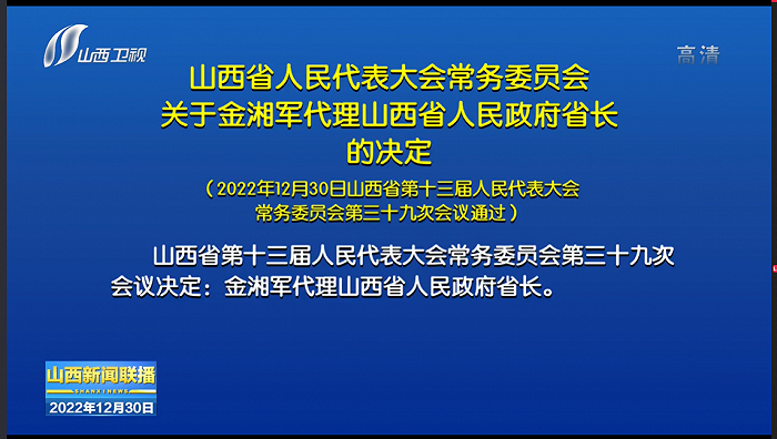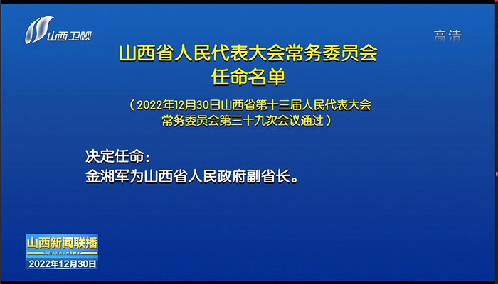 据山西省新闻联播12月30日消息,山西省十三届人大常委会第三十九次会议通过,决定任命:金湘军为山西省人民政府副省长、代理省长。