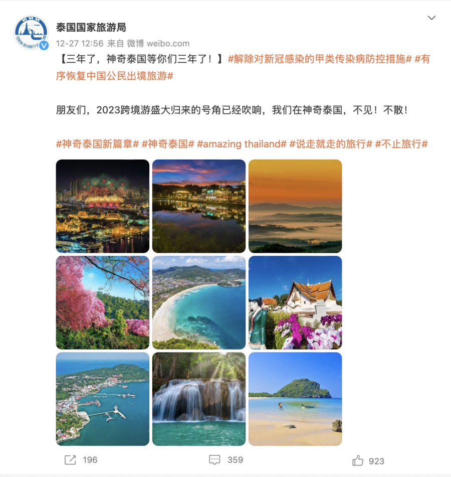 泰国国家旅游局12月27日午间发帖表示,“三年了,神奇泰国等你们三年了!朋友们,2023跨境游盛大归来的号角已经吹响,我们在神奇泰国,不见!不散!”
