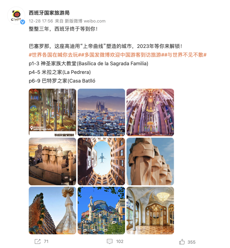 西班牙国家旅游局12月28日发帖:“整整三年,西班牙终于等到你!巴塞罗那,这座高迪用‘上帝曲线’塑造的城市,2023年等你来解锁!”