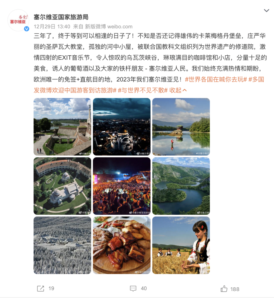塞尔维亚国家旅游局12月29日下午发帖:“三年了,终于等到可以相逢的日子了!不知是否还记得雄伟的卡莱梅格丹堡垒,庄严华丽的圣萨瓦大教堂,孤独的河中小屋,被联合国教科文组织列为世界遗产的修道院,激情四射的EXIT音乐节,令人惊叹的乌瓦茨峡谷,琳琅满目的咖啡馆和小店,分量十足的美食,诱人的葡萄酒以及大家的铁杆朋友 - 塞尔维亚人民。我们始终充满热情和期盼,欧洲唯一的免签+直航目的地,2023年我们塞尔维亚见!”