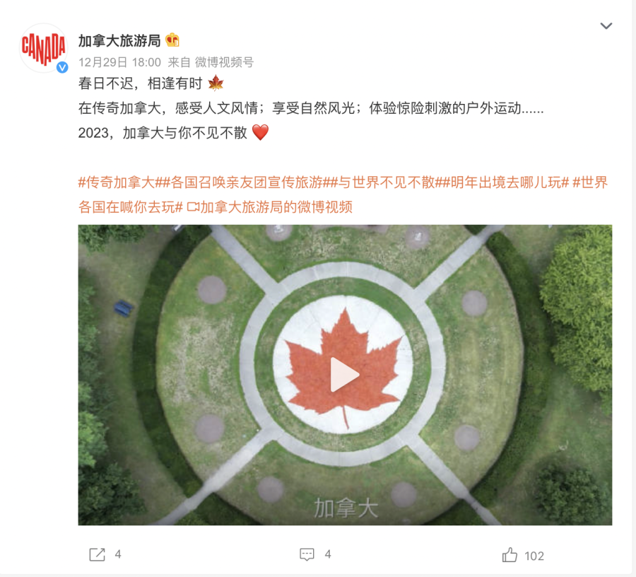加拿大旅游局12月29日晚间发帖:“2023,加拿大与你不见不散。”