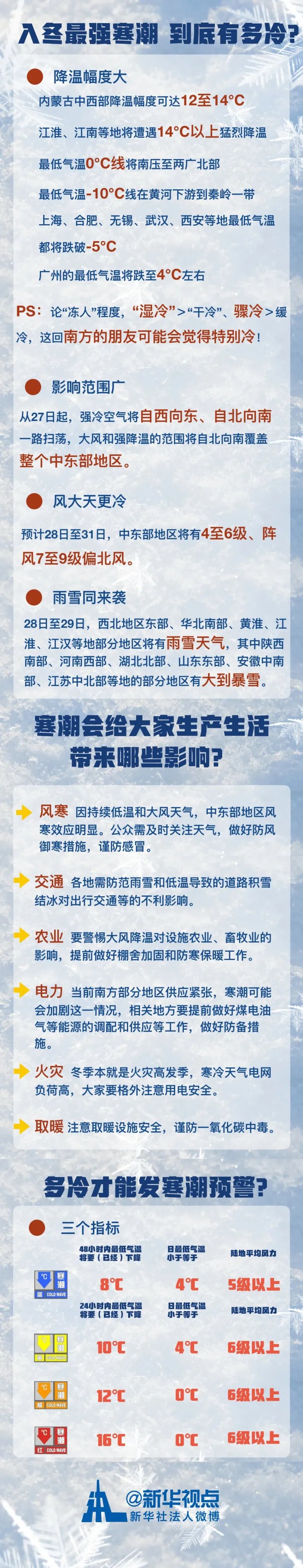 一般来说,冬季“湿冷”要比“干冷”体感冷,骤冷要比缓冷体感冷。此次寒潮影响下,南方地区气温骤降、且空气湿度较大,公众对寒冷的感受可能会更突出。
