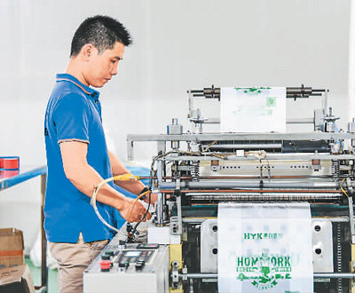 在海南海口,一名工作人员正在车间生产全生物降解袋。 新华社记者 蒲晓旭摄