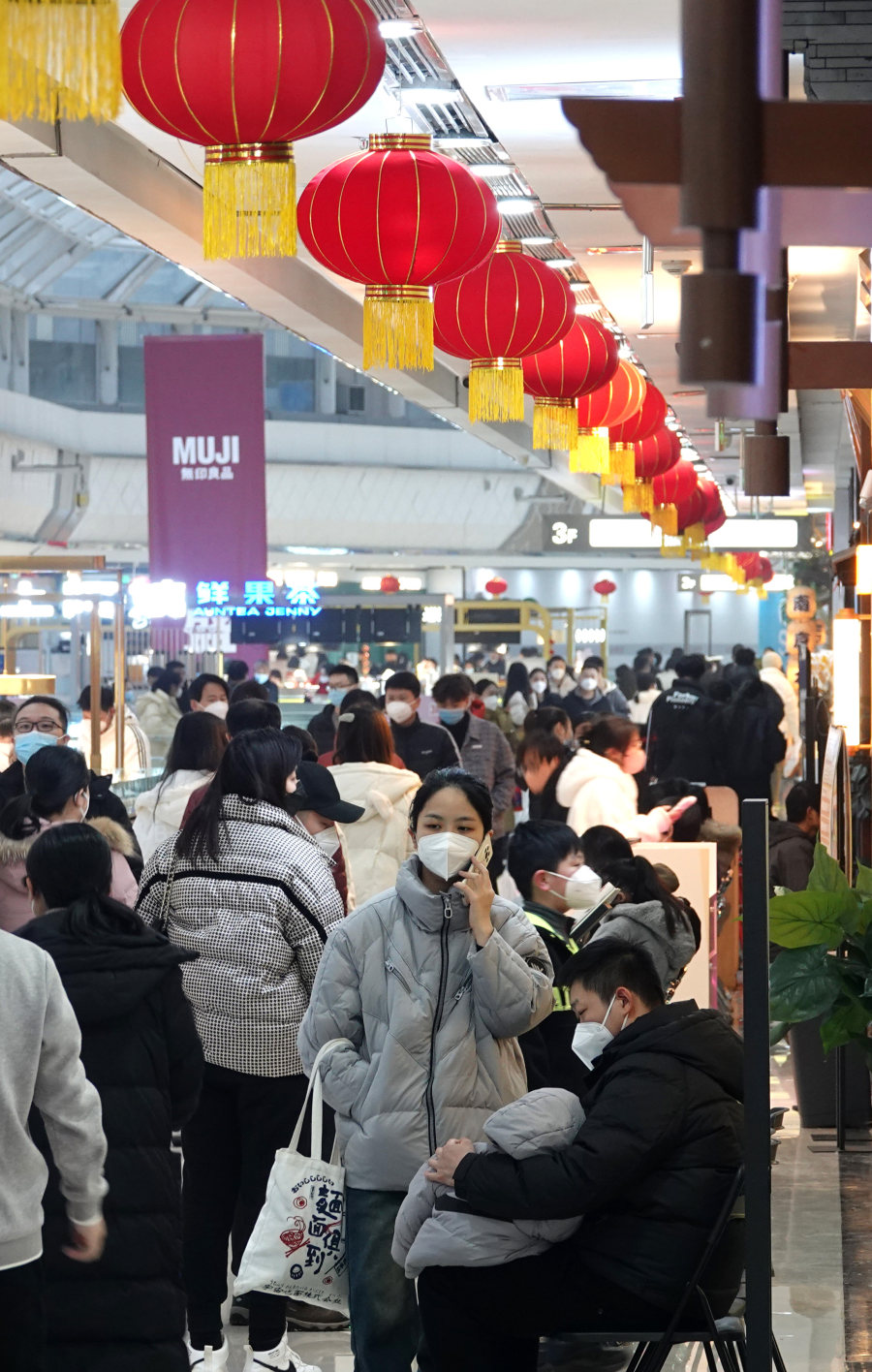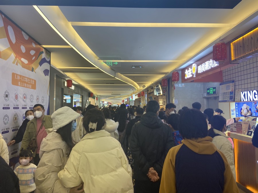 “从圣诞就已经开始人流剧增,现在门店几乎每天都会出现排队情况。好久没见过这画面了,说来还有点激动,真希望能一直这么热闹下去。”大卫城负一楼餐饮区某鱼丸店工作人员,在下午趁着打扫的闲暇之余给记者说到。