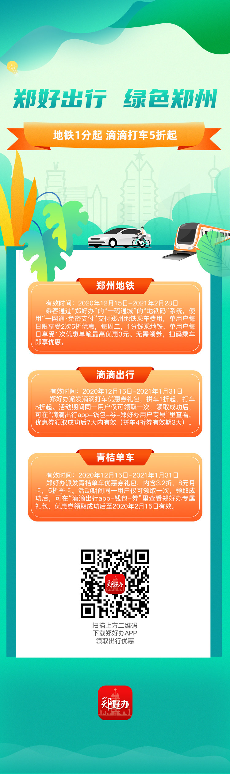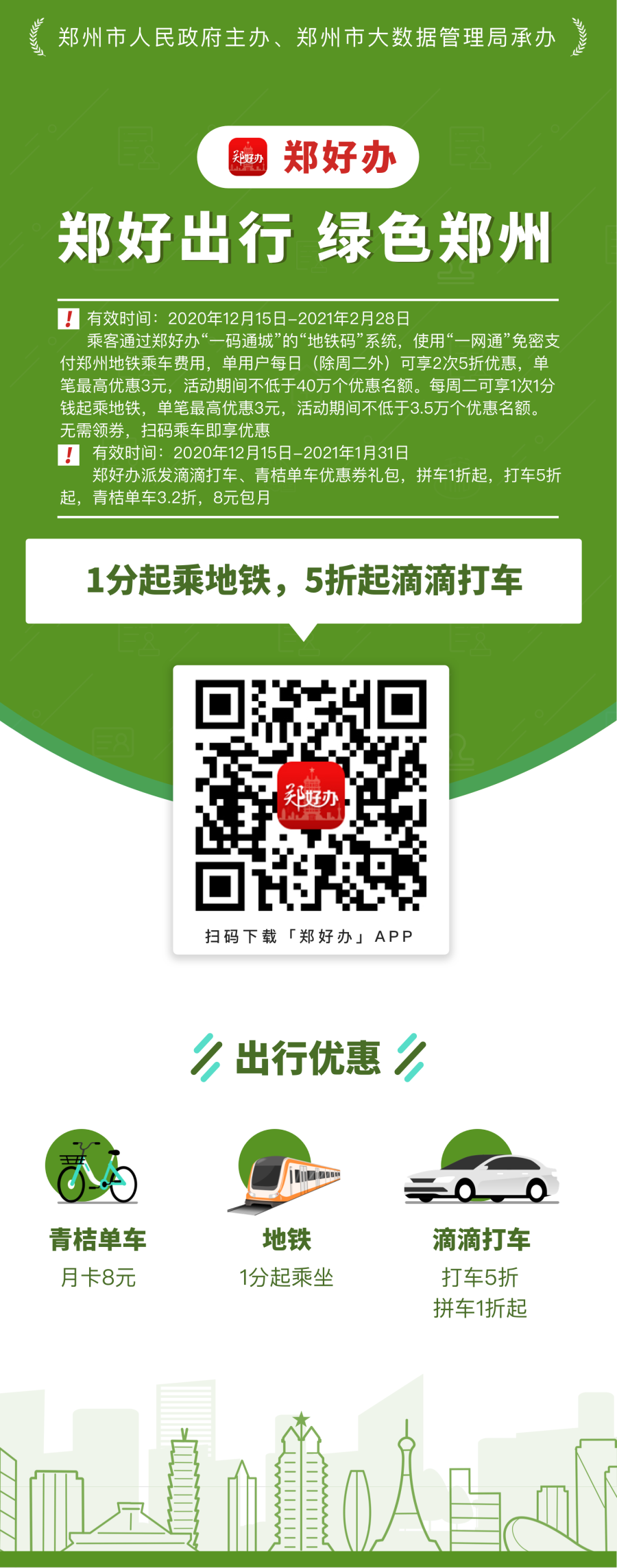 此外,郑好办还联合滴滴出行、青桔单车推出了5折打车、5折季卡等活动。