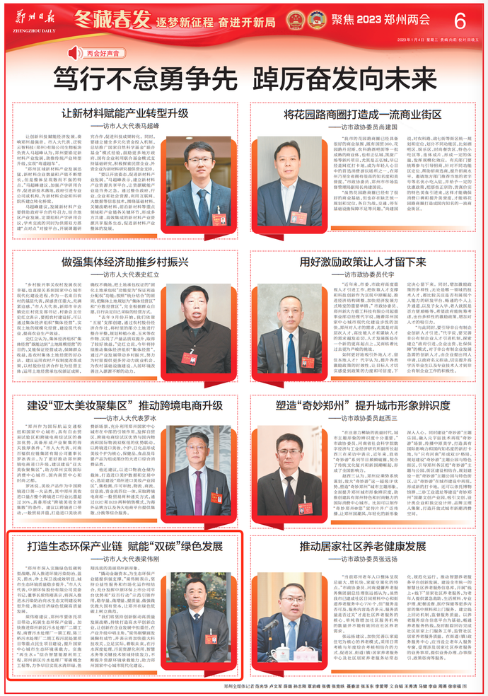 “郑州市深入实施绿色低碳转型战略,深入推进环境污染防治,蓝天、碧水、净土保卫战成效明显,城市生态环境质量稳步提升。”市人大代表,中原环保股份有限公司党委书记、董事长梁伟刚表示,将深入推进水污染防治向水生态文明建设转型升级,推动经济绿色低碳高质量发展。