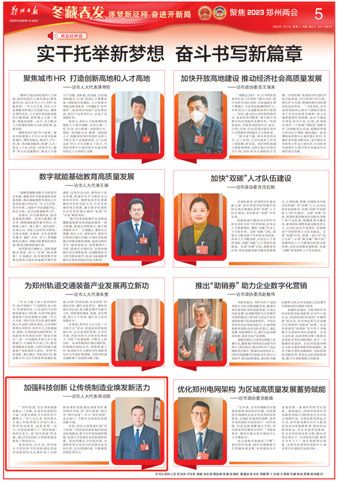 “‘郑州创造’为全球高铁建设做出了贡献,这是科技创新的力量,也饱含着新大方团队的不懈努力。”市人大代表、郑州新大方重工科技有限公司设计部工程师周治国说,创新是第一动力,科技创新赋予了“郑州制造”新的生命力,是“郑州创造”的灵魂,通过科技创新让传统制造业焕发了新的活力。