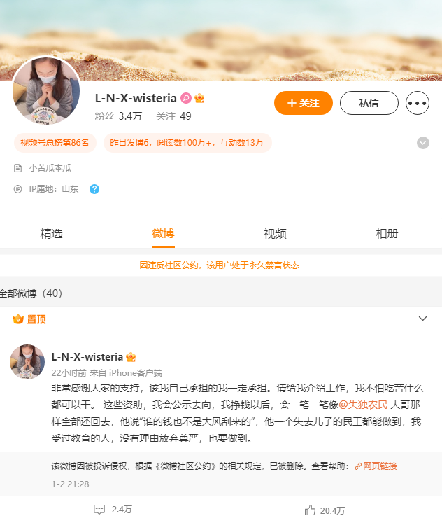 刘鑫微博被永久禁言,此前曾募捐70万赔款