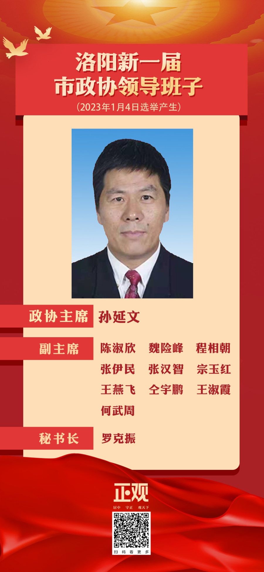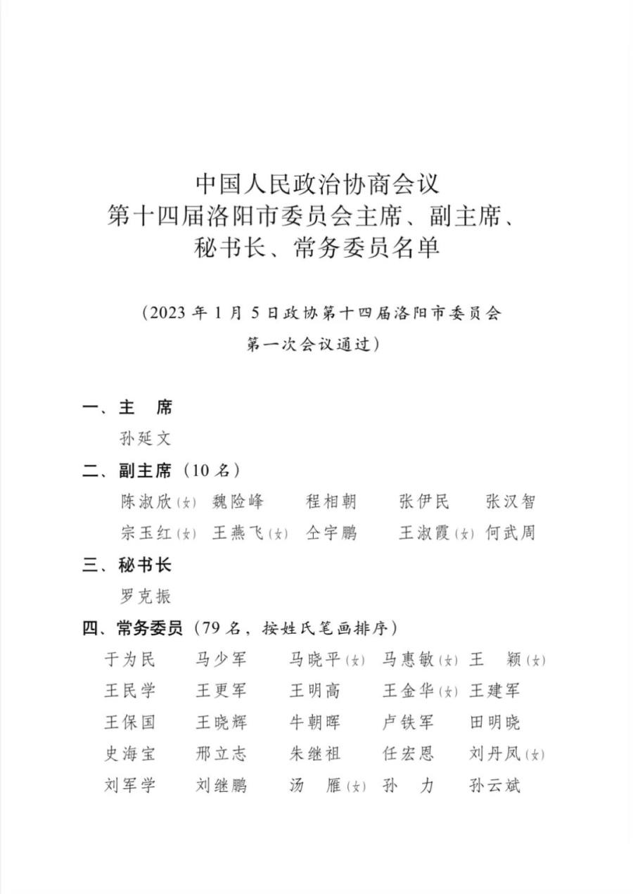 在5日下午举行的洛阳市政协十四届一次会议选举大会上,孙延文当选洛阳市政协主席;陈淑欣、魏险峰、程相朝、张伊民、张汉智、宗玉红、王燕飞、仝宇鹏、王淑霞、何武周当选副主席;罗克振当选秘书长;于为民等79名委员当选常务委员会委员。