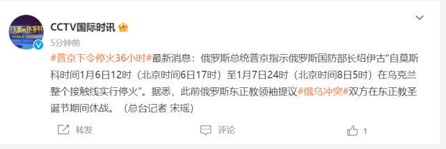 据CCTV国际时讯,俄罗斯总统普京指示俄罗斯国防部长绍伊古“自莫斯科时间1月6日12时(北京时间6日17时)至1月7日24时(北京时间8日5时)在乌克兰整个接触线实行停火”。据悉,此前俄罗斯东正教领袖提议俄乌冲突双方在东正教圣诞节期间休战。