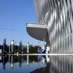 天健湖智联网产业园展示中心 充满自由变化感的竖向钢质线条在水面倒影