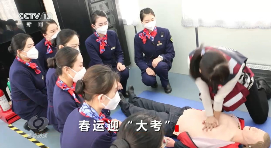 中国铁路郑州局集团有限公司郑州客运段北京一队党总支书记雷俭华:“面对当前疫情,在大基数、大客流的情况下,春运旅客出行,在途中出现身体状况异常的概率会比平时要高一些。为保障春运期间旅客平安出行,我们专门制定了培训计划和应急方案,以此来提高乘务人员在值乘时面对旅客的突发情况进行紧急救治,同时也提高工作人员的自救技能。”