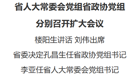 会上,省委常委、组织部长陈舜宣读决定。经省委研究,决定由孔昌生同志担任省政协党组书记,刘伟同志不再担任省政协党组书记;李亚同志担任省人大常委会党组书记,孔昌生同志不再担任省人大常委会党组书记。