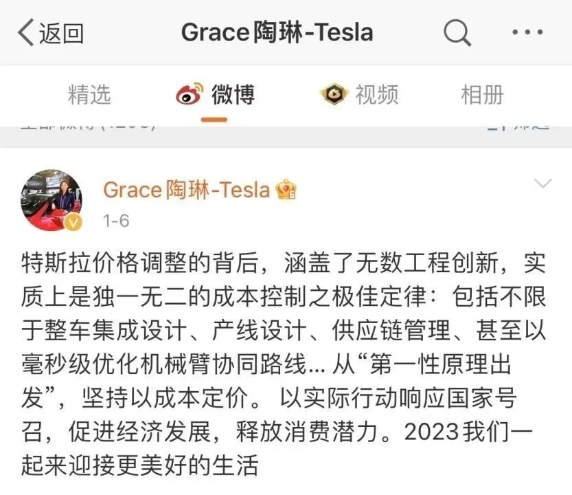 特斯拉宣布降价当日,特斯拉对外事务副总裁陶琳就给出了回应,“特斯拉价格调整是从‘第一性原理出发’,坚持以成本定价。”