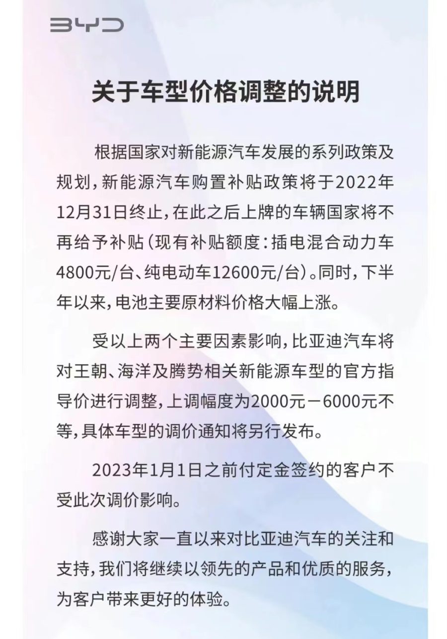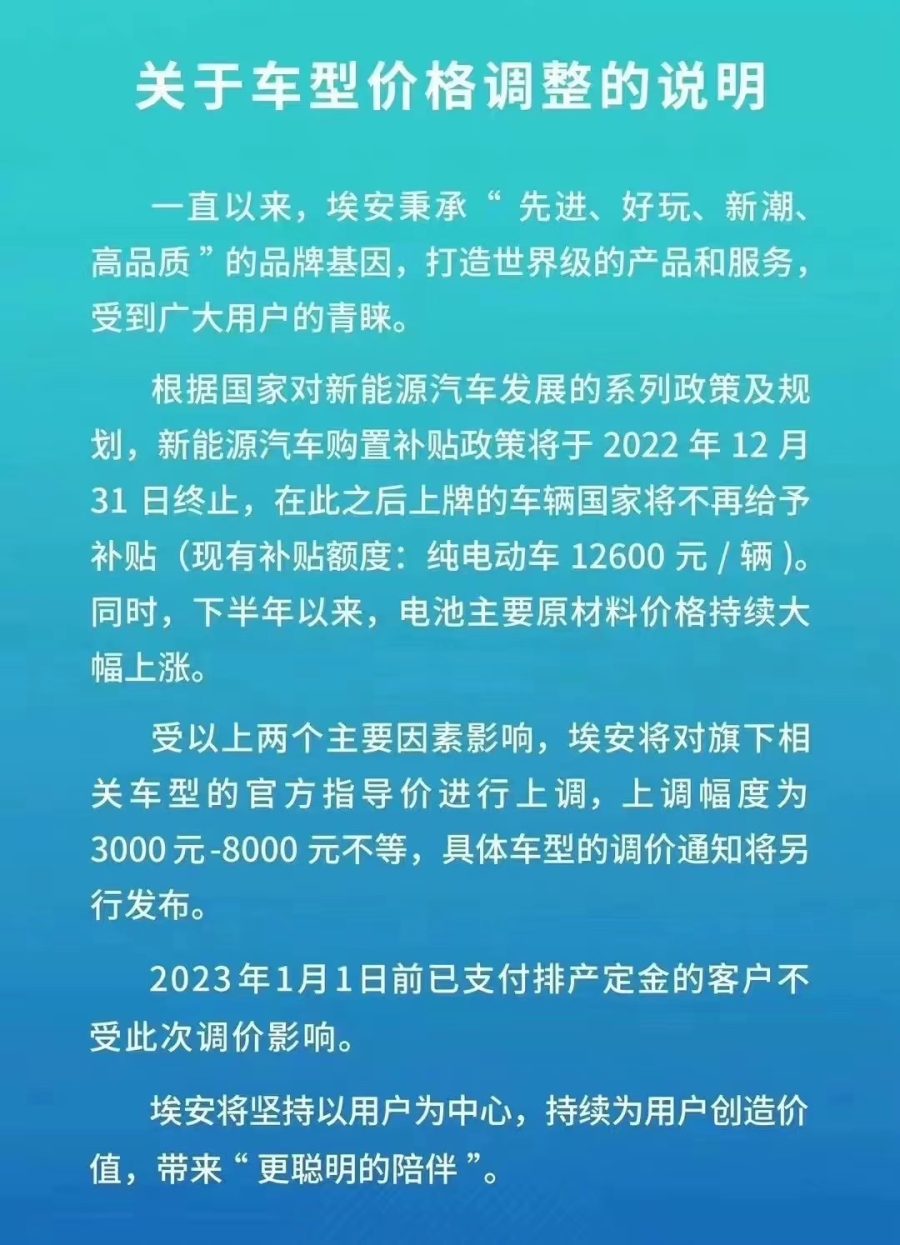 除了比亚迪之外,广汽埃安也发布通知称,将在2023年对相关车型上调价格3000元到8000元不等。