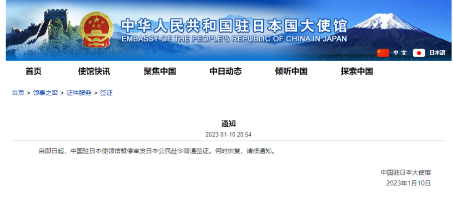 中国驻日本使领馆:暂停审发日本公民赴华普通签证
