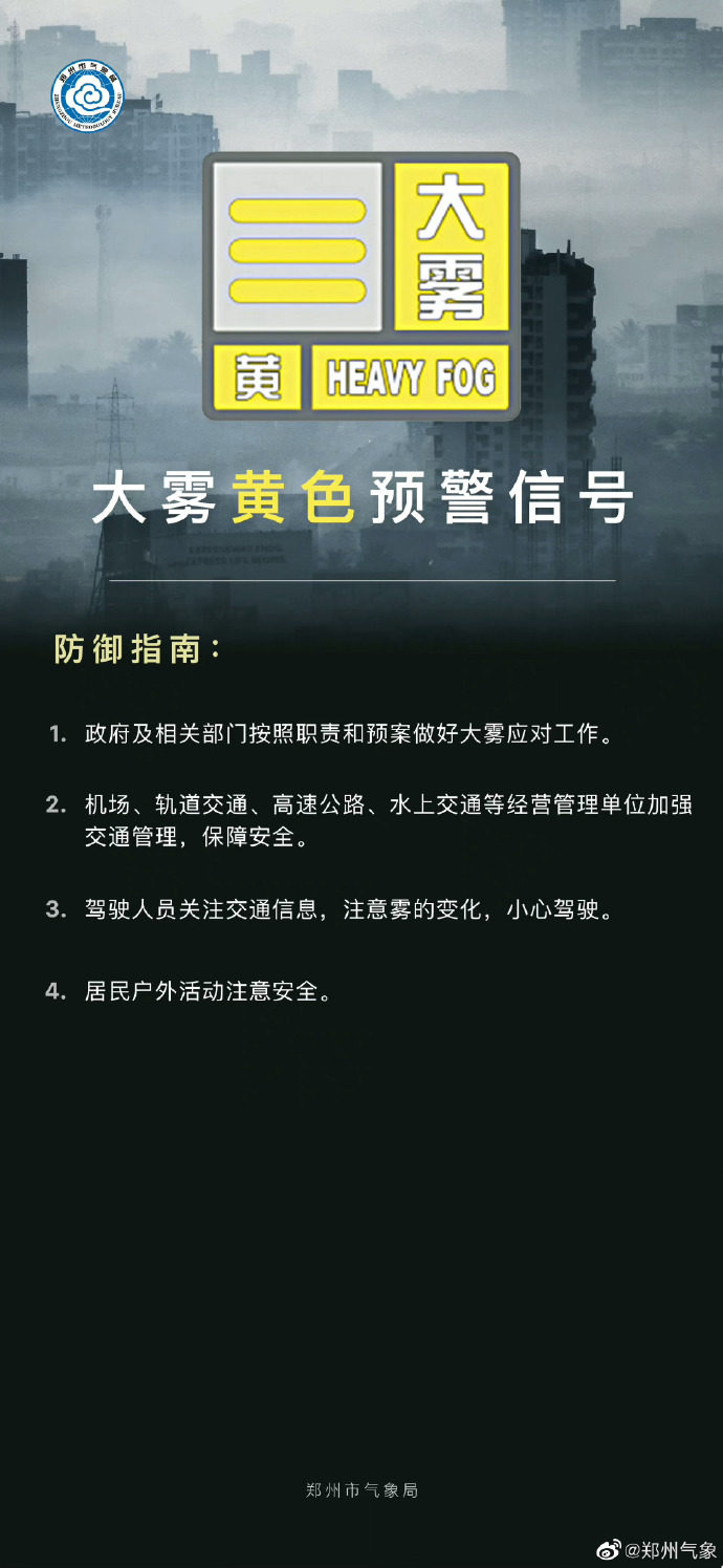 局部能见度小于200米!郑州发布大雾黄色预警