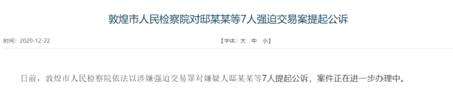 近日,甘肃敦煌市人民检察院依法以涉嫌强迫交易罪对犯罪嫌疑人邸某某等7人提起公诉,案件正在进一步办理中。事缘9月3日,有网友发布视频曝光敦煌市“陷阱公厕”乱象。邸某某等不法分子在距离敦煌市区50多公里的215国道附近,打着经营“沙漠越野基地”的幌子,以公厕为诱饵,使来往车辆驶进厕所前的松软沙地被困,然后借机强行索要高额拖车费,并阻止他人救援。(12月28日《中国青年报》)
