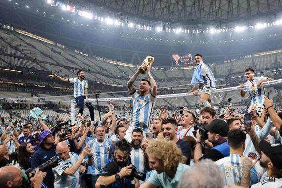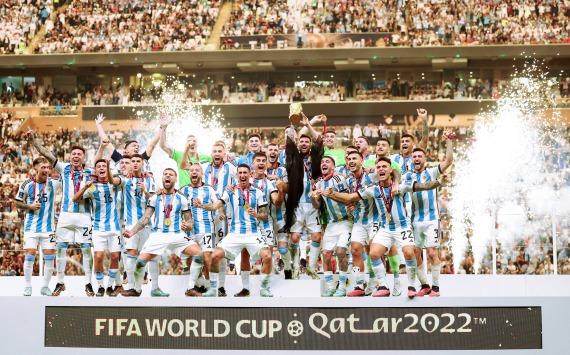 2022年12月18日,在卡塔尔世界杯决赛中,阿根廷队与法国队在常规时间和加时赛战成3:3平,通过点球大战阿根廷队以总比分7:5夺冠。图为阿根廷队球员在颁奖仪式上庆祝。新华社记者李明摄