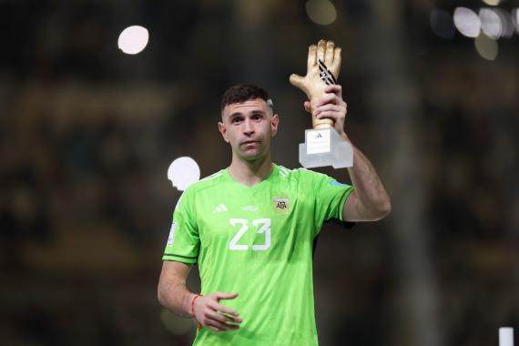 2022年12月18日,阿根廷队守门员马丁内斯获得世界杯“金手套”奖。新华社记者李明摄
