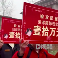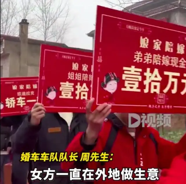 安徽阜阳婚车司机周先生日前发的一条视频显示,新娘亲友们举着横幅,上面写着“彩礼分文不取,陪嫁208万”。此外,还有人举着“房产一套”“凯迪拉克轿车一辆”“弟弟陪嫁现金壹拾万”“姐姐陪嫁现金壹拾万”等牌子。